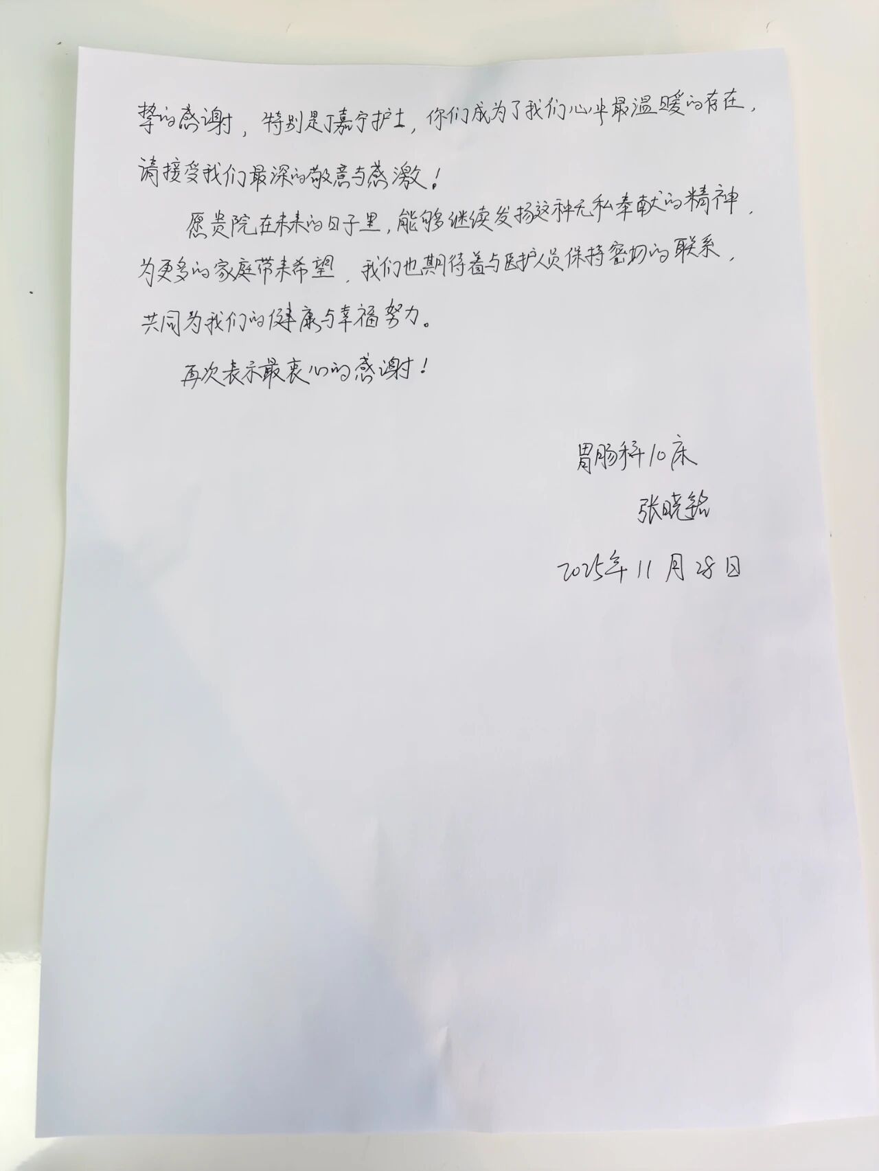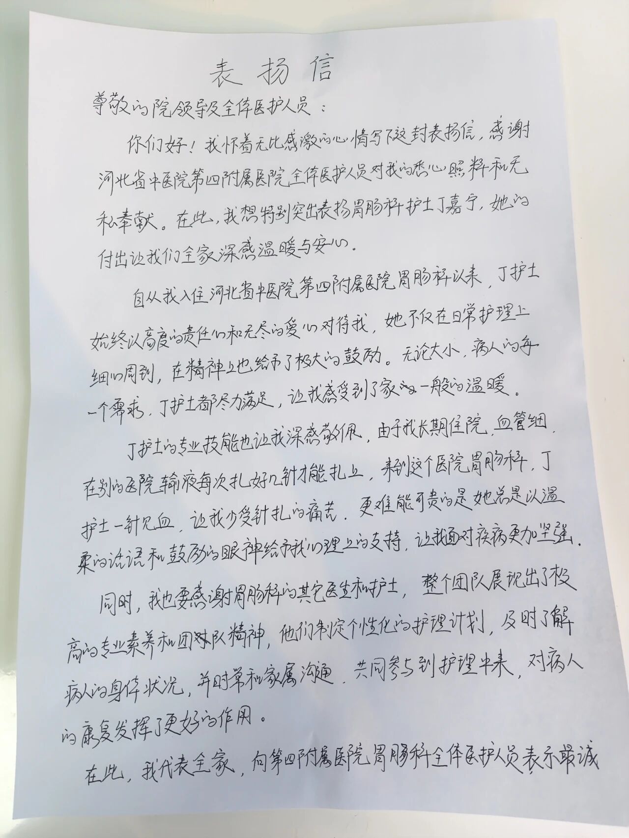 近日,我院收到了一封脾胃病科患者张晓铭的亲笔表扬信。信中,患者用真挚朴实的语言,表达了对责任护士丁嘉宁及全体医护人员的感激之情。