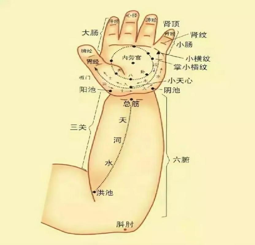 退六腑从肘横纹推向腕横纹,能清热、凉血、解毒,主治一切实热证。