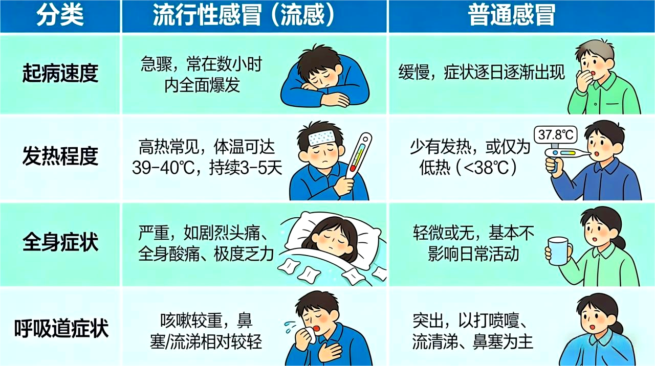 春季是呼吸道疾病高发季,流感与普通感冒病因、症状、危害差异明显,盲目居家处理易加重病情。